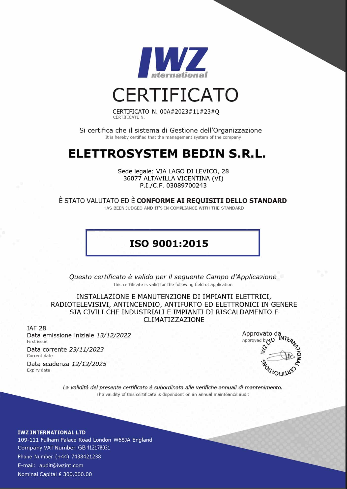 La certificazione ISO 9001:2015 attesta l'impegno di Elettrosystem Bedin verso la qualità in ogni fase del processo produttivo. Questa certificazione riconosce la nostra capacità di fornire costantemente prodotti e servizi che soddisfano i requisiti dei clienti e i requisiti normativi applicabili.